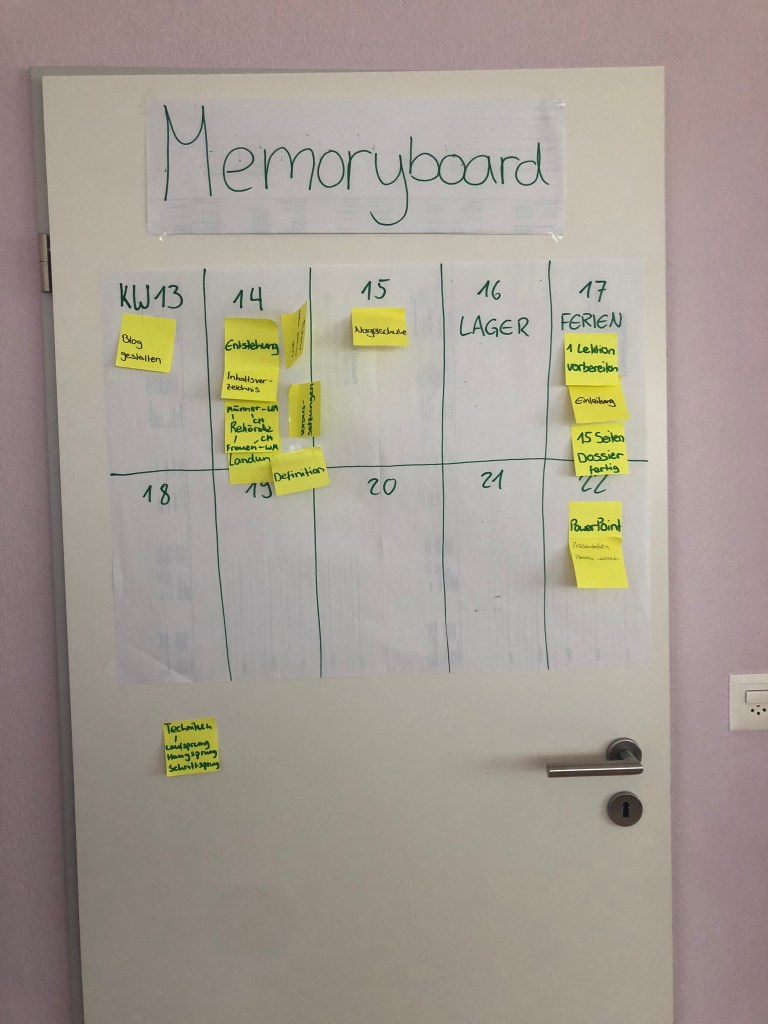 Ich freue mich an meinem Projekt weiter zu arbeiten. Die Memoryboard bewährt sich sehr gut. Dadurch verliere ich den Überblick nie und sehe immer, wann ich was erledigen muss. So hoffe ich, dass ich zum Schluss nicht in Zeitnot komme.